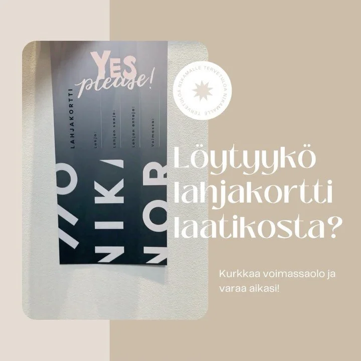Anna ystävälle tai rakkaalle lahjaksi hyvinvointia ja hyvää fiilistä. Lahjakortti on tervetullut ja helppo lahja juhlaan, kiitoksena tai muistamisena.